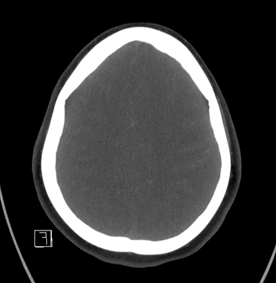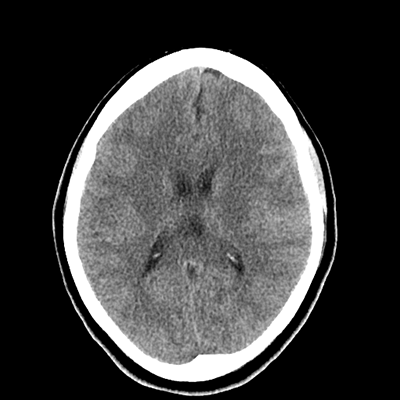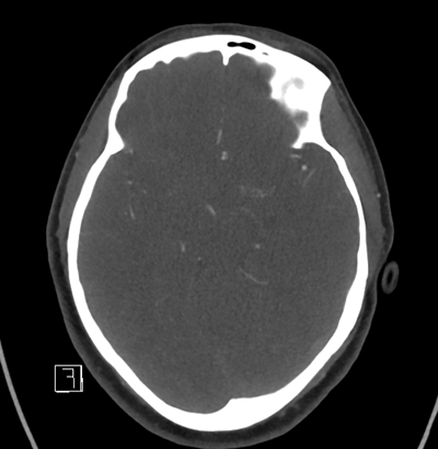 With that in mind, as we look at her neuroimaging, it's subtle, but we can appreciate a faint SAH in the left frontal lobe convexity. Her vessel imaging is unremarkable.