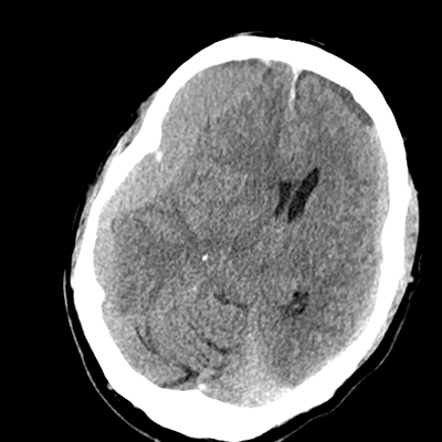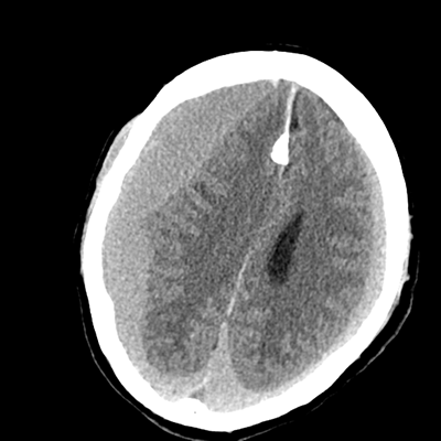 Aside from these obvious extraaxial abnormalities, there's another subtle finding. The patient is known to have had a prior head CT when he had his initial fall a few weeks ago, with the report noting that there was diffuse cerebral volume loss. At his age, we'd expect to see more sulcation. We don't. He doesn't because these hematomas are compressive and he's developed a little cerebral edema as well.