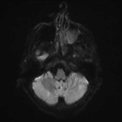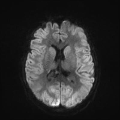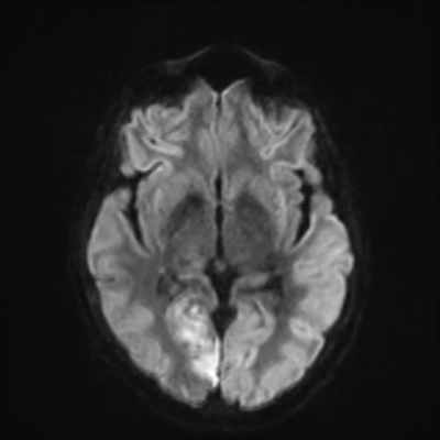 You can clearly see diffuse cortical and basal ganglia diffusion restriction, and that of his deep cerebellar nuclei as well. The right occipital lobe abnormalities are a little more prominent, but then you remember that he is known to have had a right occipital stroke weeks ago.
