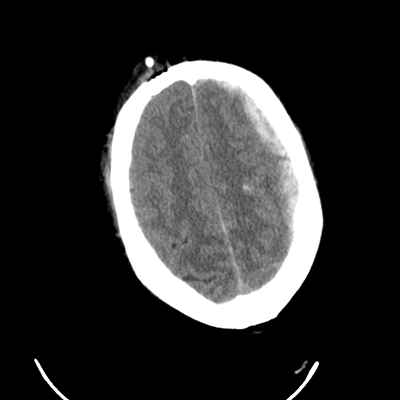 In the ED, initial vitals are notable for BP 110/76, HR 114, SpO2 92%, T 37C. Non-contrast head CT (shown here) as well as CTA head/neck are obtained. You are then consulted. You ask them to hold his propofol and fentanyl so that you can properly examine him once you arrive.